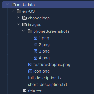 Fdroid uses metadata files to find app descriptions and storefront images. Here is a list of files you should create, at the root of your project: